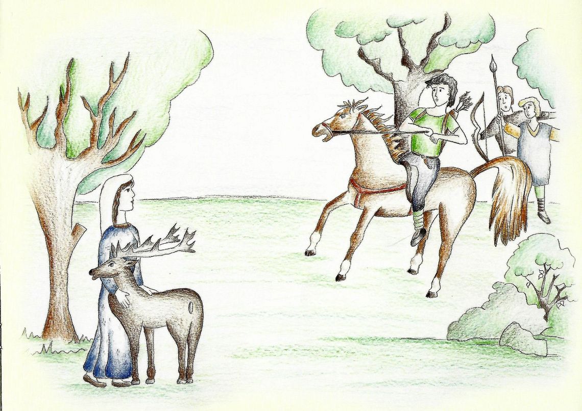 Plötzlich hörte Ida laute Jagdhörner und wildes Hundegebell aus der Ferne. Sie sah einen jungen Hirsch in Richtung Waldlichtung zulaufen. Ida nahm den Hirsch in die Arme und beruhigte ihn. Die Jäger auf ihren Pferden sahen Ida mit dem Hirsch und kehrten um. Sie hatte dem Hirsch das Leben gerettet.